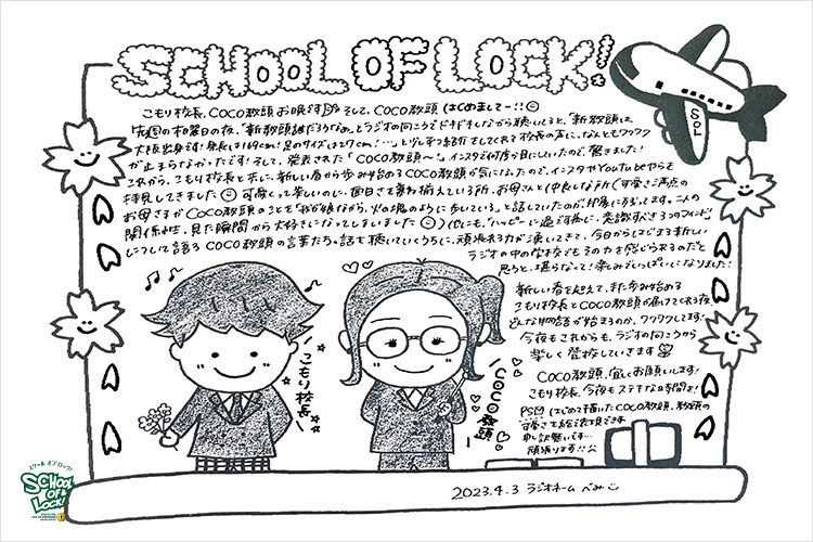こもり校長「ただ1つだけ。ここはラジオの中の学校ですから、学校というのは、そこに通っている生徒が全て。つまり、ラジオの前の生徒が、このSCHOOL OF LOCK!の全てです。これから目の前の生徒に向けて、僕ら2人で届けて行きましょう。COCO教頭、よろしく!」