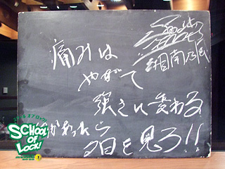 最後に、湘南乃風先生からのメッセージを黒板に書いてもらいました! 今夜書いてくれたのは、SHOCK EYE先生です。 痛みはやがて強さに変わる 何かあったら夕日を見ろ!! さっきのぎゅ-どんちゃんにも言えることだけど、 辛いことがあっても、これを乗り越えたら強さになるし、 いろんな関係を乗り越えて絆になっていく。 昔の思い出を思い返して、 良い思い出をもう1回再現してもらえたらいいな、 という思いを込めて書きました。 |
