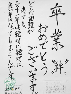 たくさんの卒業生達! 全国のみんなに向けての卒業式でした!! とーやま校長が書いた黒板の『 いつの日か 』も、 そこまで遠くない日かもしれない。 みんな、今日のことを将来自慢してくれ! SCHOOL OF LOCK! は、 明日もこの場所でラジオをやります! だからみんな、安心して明日も会いましょう! 高橋優先生、本当にありがとうございました!! 被災地の皆さんも、本当に力になったと思います。 SCHOOL OF LOCK! は、明日夜10時に再び開校!!! また明日! |