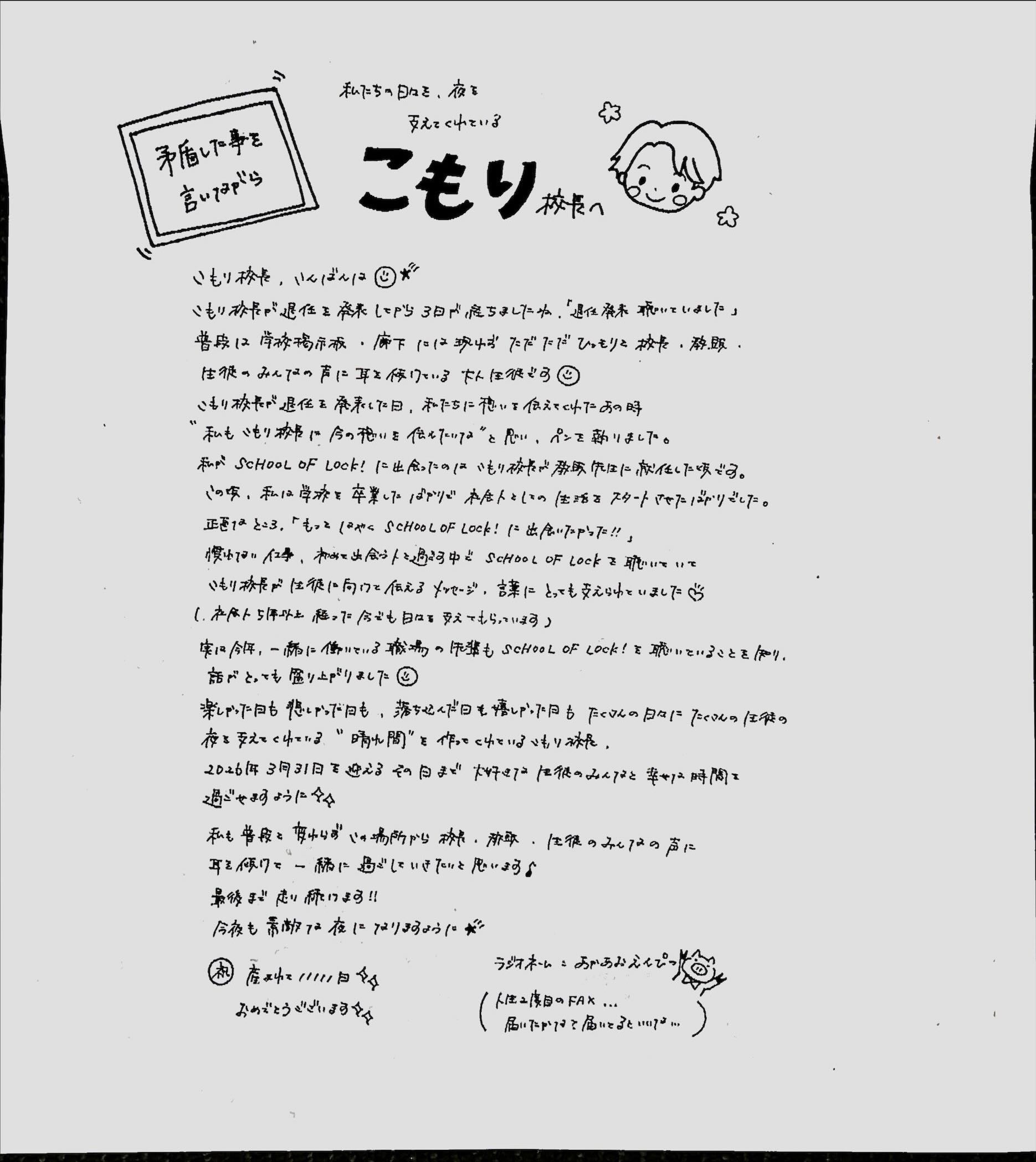 引き続き、みんなからの「質問・近況報告・こんなイラスト描いたよー!」などなど...遥香先生へのメッセージも募集中!! 「乃木坂LOCKS!(賀喜遥香)掲示板」& 「メール」からお願いします!!