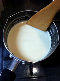 牛乳を小鍋に入れ火にかけ、うっすら湯気がたち鍋肌に泡ができるまで温めたら、少しずつ【7】へ、混ぜる手を止めずに加えます。そこに薄力粉を加え、ダマにならないようよく混ぜます。