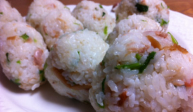 大好物の梅干しをはじめ、小松菜やなめこなどと混ぜています。