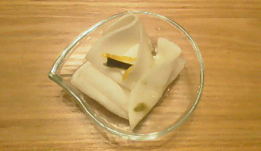 かぶをスライスして酢と砂糖と塩と昆布の千切りと柚子の皮の千切りを混ぜて出てきた汁で混ぜて漬けています
