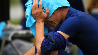 ベンチへの挨拶後、次々と選手がグランドにへたり込んだ。感情を抑えきれず、下を向いて泣き始める。タオルを頭にかけ、背中を震わせる。 |