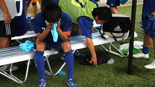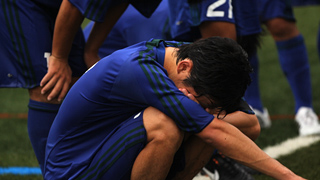 ゴールキーパーがグローブを投げ、座り込んで顔を覆った。選手たちの嗚咽が重なる。ベンチにようやく座ることができた選手は、両手で顔を覆ったまま顔を上げることができない。監督も控えの選手も、泣いている選手に誰も声をかけられずにいた。涙では拭えないほどのショックと悔しさが、富岡高校のベンチをいつまでも覆っていた。 |
