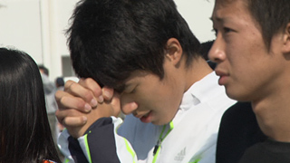 天気はまばらな雨。大会をあさってに控えたこの日。盛岡中央高校・陸上部の選手はグランドではなく中庭のような小さなコートで練習を行っていた。3年生はたったの3人。その3人は最後の大会に、メンバーとして走る予定だ。軽いジョックを行った後、2人1組でマッサージを入念に行う。「体調管理には気をつけろよ」という監督の言葉で、この日の練習は締めくくられた。 |