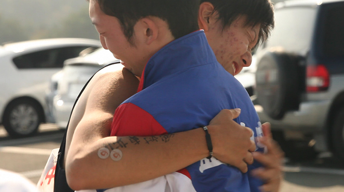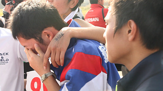 駆け寄って号泣する部員たち。