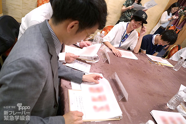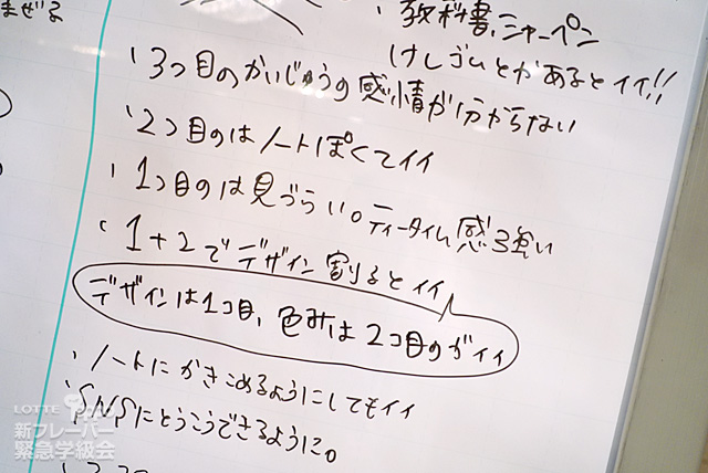 この議題では「このパッケージだと男の子が買いづらい!」「これだと色が明るいからもう少し暗い色を入れたほうが良い!」「このパッケージとこのパッケージを足して割ったものが良い!」などの意見が出ました!