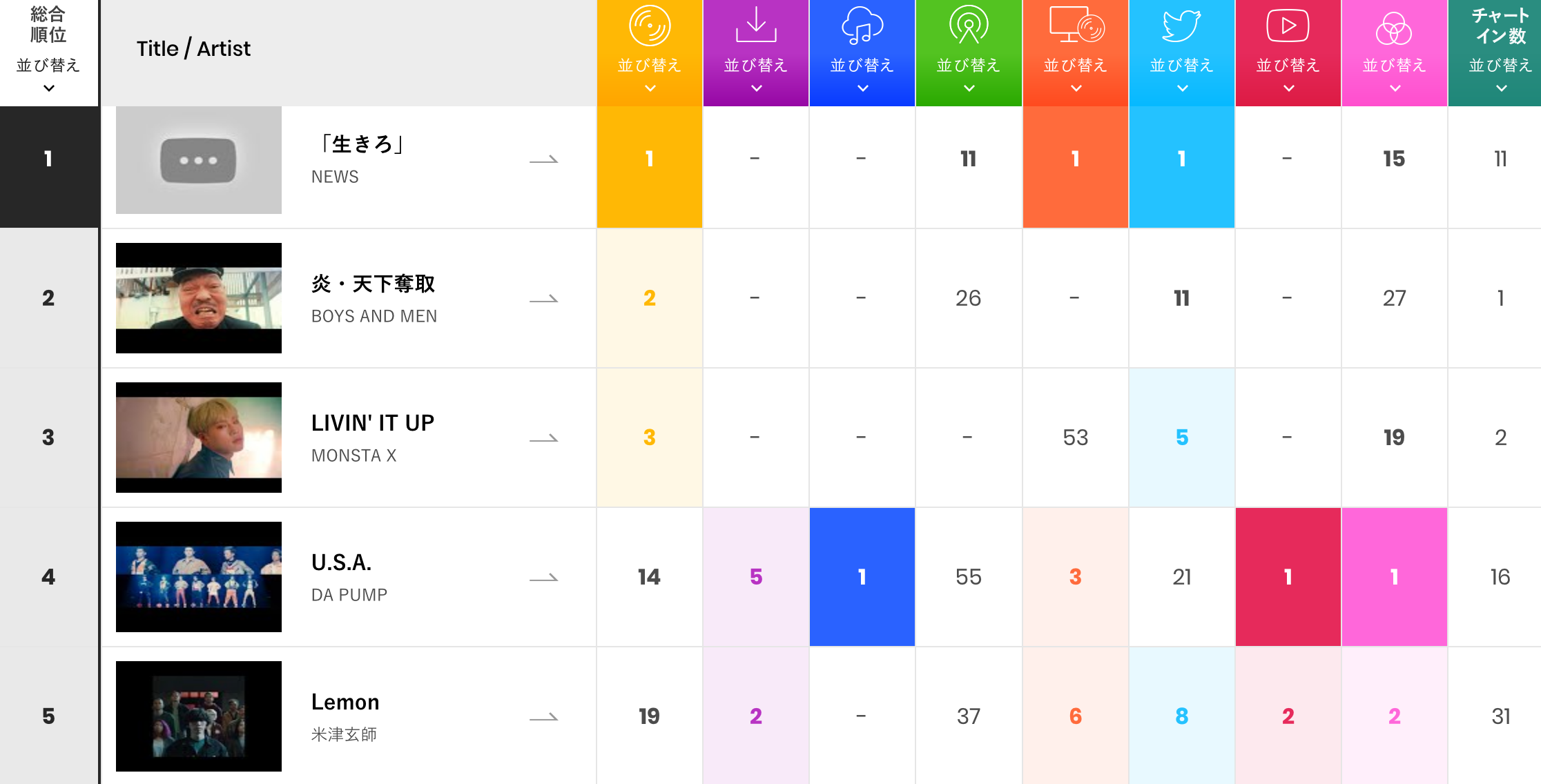 今週はNEWS「「生きろ」」が総合首位を獲得!