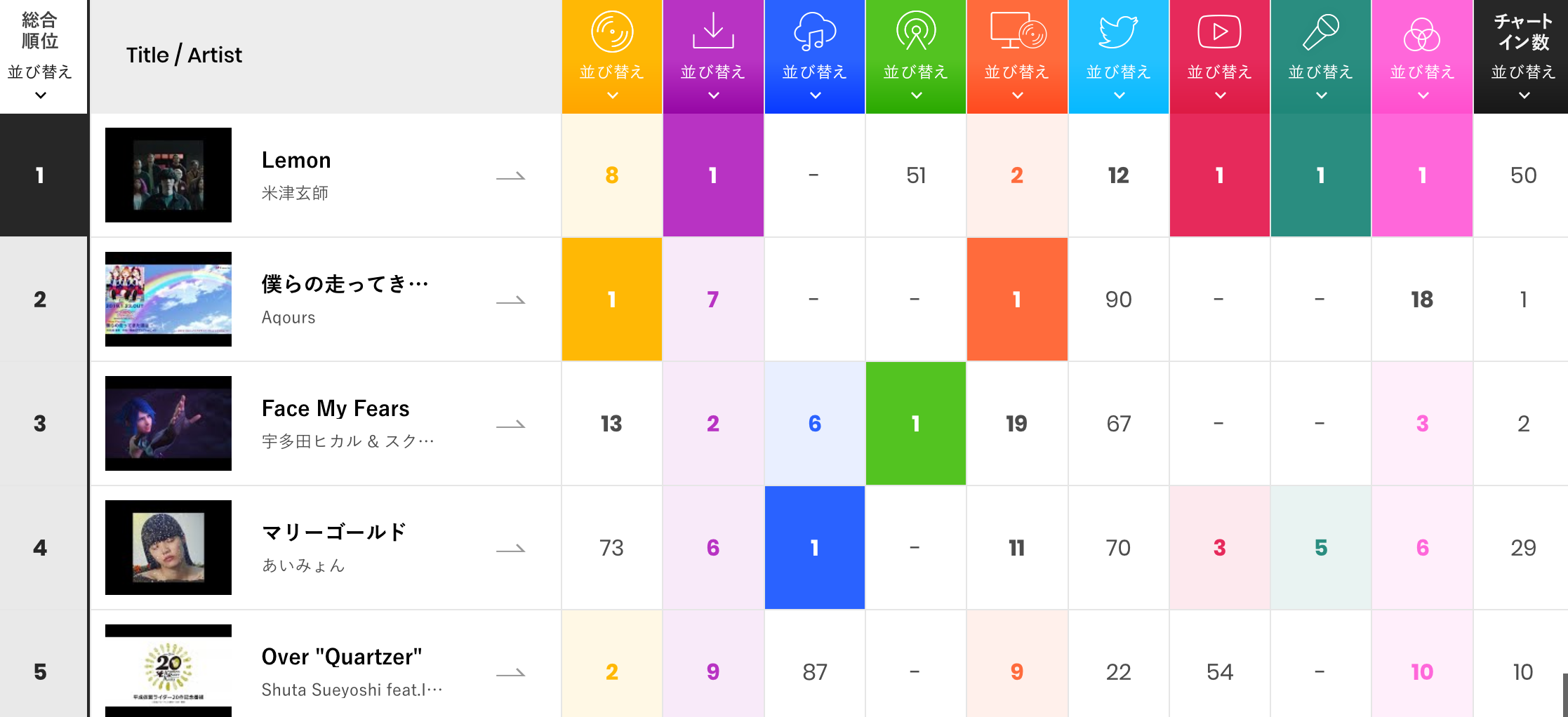 今週は、なんと5週連続米津玄師さんの「Lemon」が総合首位を獲得!