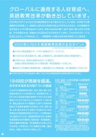 2020年に向けて子どもたちの英語教育が大きく変わろうとしています。小学校での英語教科化を見越して、英語を入試科目に採用する私立中学がふえるなど、その影響はさまざまなところで現れ始めています。問われるのは「聞く・話す・読む・書く」の4つの技能。その評価のため、英検などの活用も広がりを見せています。これからのグローバル社会にふさわしい力をめざして̶̶英語教育への関心がますます高まっていきます。グローバルに通用する人材育成へ、英語教育改革が動き出しています。1848校が英検を優遇。ますます高まる外部テストの価値●小3から英語授業スタート!早い段階からベースづくり。●小5からは「読み書き」も。親しむ英語から、読み書きも含めた英語学習へ。●中学からは、英語の授業中はすべて英語で。 目標は「英検3級程度」から「英検3級~準2級程度」へ引き上げ。●高校での目標は「英検準2級~2級程度」から「英検2級~準1級程度」へ引き上げ。※小学校では2018年度から移行措置がとられる見込みです。2020年に向けた英語教育改革の主なポイント■2020年に向けて大学入試も改革。英検、TOEFLなどの実績を優遇する制度も検討されています。これからの英語教育は「聞く・話す・読む・書く」の4技能を伸ばすことが目標です。学校教育では、この4つの力を測定可能な英検やTOEFLなど外部検定テストがこれまで以上に活用されつつあります。現在公表されている範囲で入試や入学後の待遇などで英検を優遇する学校は、中学、高校・高専、大学・短大合わせて全国で1848校(2015年2月時点日本英語検定協会HPより)。この傾向はさらに強まりそうです。英語教育改革では、英検の合格目標は中学卒業時に「英検3級~準2級程度」、高校卒業時「英検2級~準1級程度」に引き上げられる予定。小学校など、早い段階から4級、3級をめざし、将来につなげていきましょう。●英検のやめすは、比較的多くの学校で公表されている級を掲げました。●入試優遇のほかに、費用面優遇(入学金・授業料・奨学金、留学費用補助など)や単位認定(取得級に応じて所定の単位を認定)を行う学校も多くあります。(各地域の英検優遇校とその詳細は、英検協会HPで検索できます。)中学・高校・大学の英検入試優遇例(日本英語検定協会HPより)推薦入試出願条件指定、取得級に応じた判定優遇など※一部、5級でも優遇される学校もあります。4級3級一般入試取得級に応じた判定優遇、学科免除、点数加算など※一部、5級でも優遇される学校もあります。4級3級推薦入試出願条件指定、取得級に応じた判定優遇など※一部、4級でも優遇される学校もあります。3級準2級2級一般入試取得級に応じた判定優遇、学科免除、点数加算など※一部、4級でも優遇される学校もあります。3級準2級2級推薦入試出願条件指定、取得級に応じた判定優遇など※一部、3級でも優遇される学校もあります。2級準1級1級一般入試取得級に応じた判定優遇、学科免除、点数加算など※一部、3級でも優遇される学校もあります。2級準1級1級中学入試高校入試大学入試優遇措置英検のめやす202020年に向けて子どもたちの英語教育が大きく変わろうとしています。小学校での英語教科化を見越して、英語を入試科目に採用する私立中学がふえるなど、その影響はさまざまなところで現れ始めています。問われるのは「聞く・話す・読む・書く」の4つの技能。その評価のため、英検などの活用も広がりを見せています。これからのグローバル社会にふさわしい力をめざして̶̶英語教育への関心がますます高まっていきます。グローバルに通用する人材育成へ、英語教育改革が動き出しています。1848校が英検を優遇。ますます高まる外部テストの価値●小3から英語授業スタート!早い段階からベースづくり。●小5からは「読み書き」も。親しむ英語から、読み書きも含めた英語学習へ。●中学からは、英語の授業中はすべて英語で。 目標は「英検3級程度」から「英検3級~準2級程度」へ引き上げ。●高校での目標は「英検準2級~2級程度」から「英検2級~準1級程度」へ引き上げ。※小学校では2018年度から移行措置がとられる見込みです。2020年に向けた英語教育改革の主なポイント■2020年に向けて大学入試も改革。英検、TOEFLなどの実績を優遇する制度も検討されています。これからの英語教育は「聞く・話す・読む・書く」の4技能を伸ばすことが目標です。学校教育では、この4つの力を測定可能な英検やTOEFLなど外部検定テストがこれまで以上に活用されつつあります。現在公表されている範囲で入試や入学後の待遇などで英検を優遇する学校は、中学、高校・高専、大学・短大合わせて全国で1848校(2015年2月時点日本英語検定協会HPより)。この傾向はさらに強まりそうです。英語教育改革では、英検の合格目標は中学卒業時に「英検3級~準2級程度」、高校卒業時「英検2級~準1級程度」に引き上げられる予定。小学校など、早い段階から4級、3級をめざし、将来につなげていきましょ