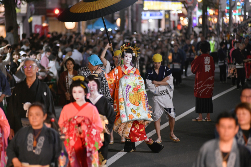 その中でも目玉の一つは「花魁道中」、さらに神輿渡りやよさこいなどの伝統的な催しも!