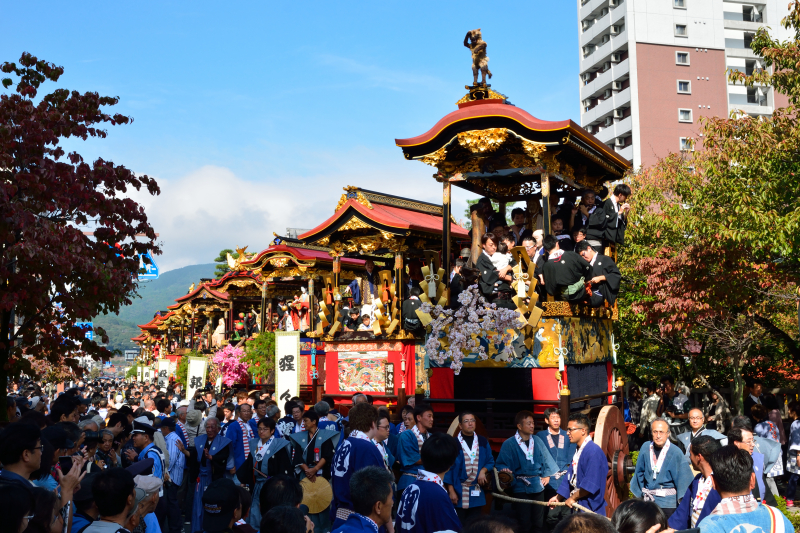 色鮮やかな幕で飾られた高さおよそ6メートルの13基の曳山は、
