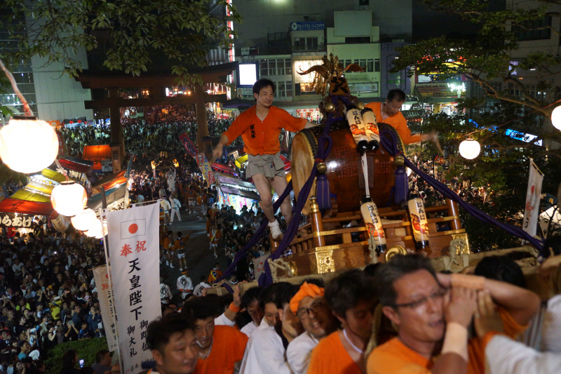 御神輿、山車、屋台、木遣り、おはやし、よさこい、和太鼓、民謡民舞、獅子舞、パレード、バンバ音頭、ダンス、マーチングバンドと、2日間ともに、にぎやかな光景が魅力です。事前に「みこしの担ぎ手募集」もあり、町内にみこしがないなどの理由で担ぎたくても担げなかった方も担ぐ機会を創設しています。小学生向けの「宮っこみこし」も出ます。