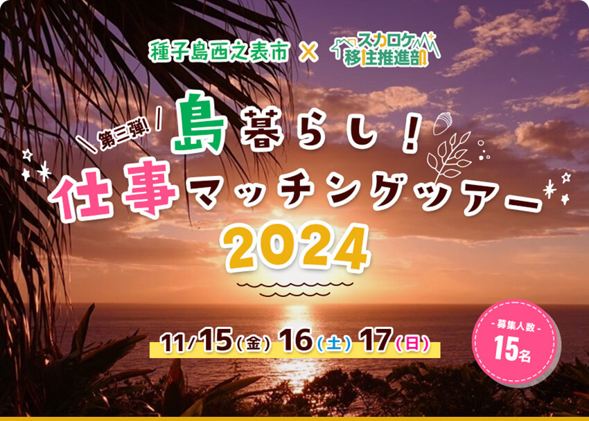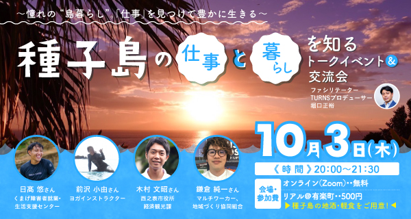 - 10月3日(木)「種子島の仕事と暮らしを知るトークイベント交流会」を開催します。こちらにもぜひご参加ください。