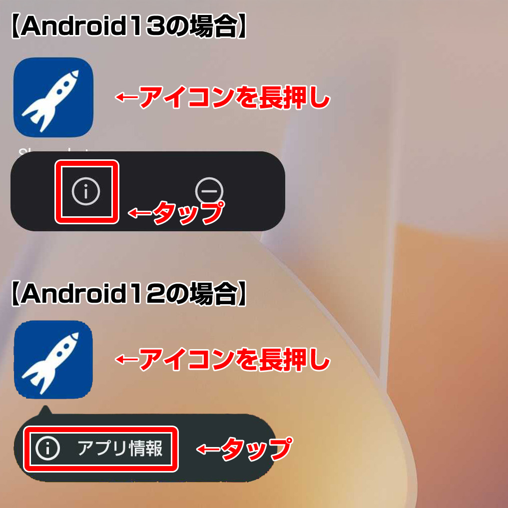 - ①スカロケアプリのアイコンを長押し→「i」もしくは「i(アプリ情報)」をタップ