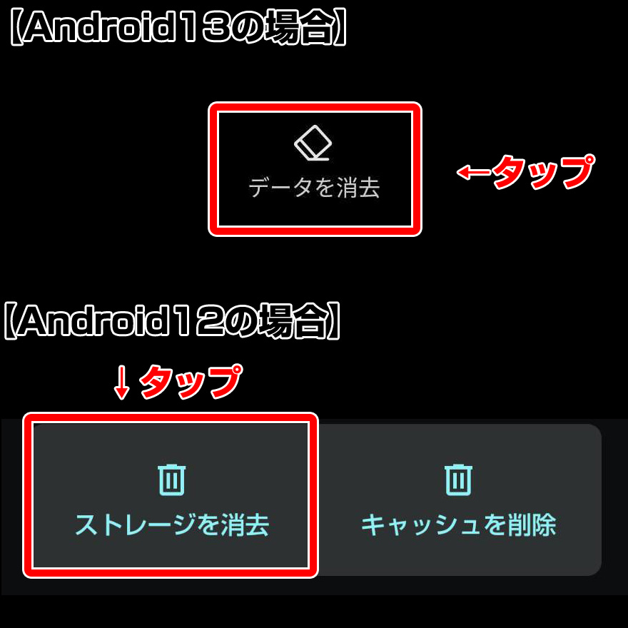 - ③「データを消去」もしくは「ストレージを消去」をタップ