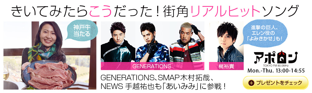 きいてみたらこうだった!街角リアルヒットソング!GENERATIONS、SMAP木村拓哉、NEWS手越祐也も「あいみみ」に参戦!「進撃の巨人」エレン役・梶裕貴の「よみきかせ」も!神戸牛をどーんと毎日プレゼント!