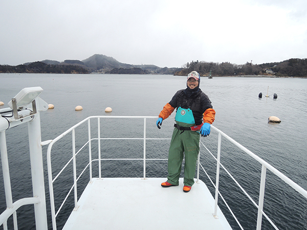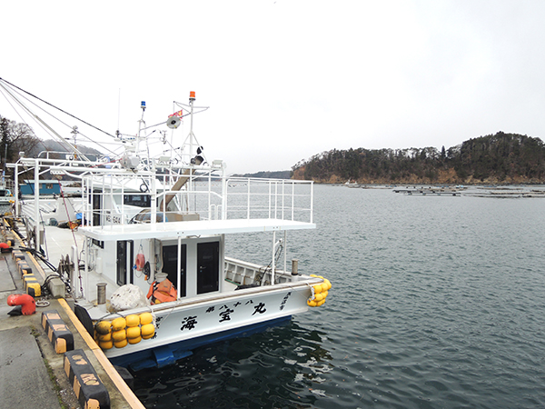 牡蠣、ホタテ、ワカメの養殖業を代々営んできた「戸羽平(とばひら)」の五代目、「漁師のやっくん」こと畠山政也さんの新造したての船、「第8海宝丸」に乗って、まずは、海の上の牡蠣の畑を見に行きます。いざ、唐桑湾へ出航!