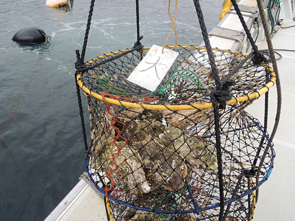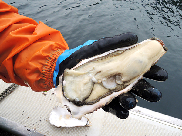 船は海の上で停止。畠山さんが海の中から、育てている牡蠣が入った網を引き上げて見せてくれました。「大」という字がありますが、ほんとうにデカいんです!! どれくらい大きいか?というと……