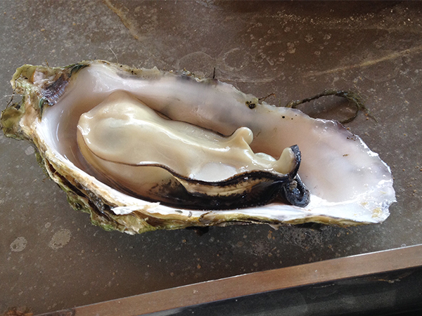 見てください、これ!なんと、殻全体に牡蠣の身が……!夏に温かいお風呂に一度漬ける、「温湯処理」ということを特別にしているのが、唐桑湾のカキ漁師たちのこだわり。この温湯処理によって、味わい深い、そして大きな牡蠣に育つのだとか。