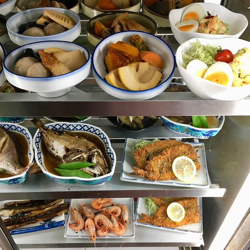 店内にはこんな感じのガラスのショーケースが2つあって、その中に、お皿に盛りつけられたいろんな料理が並んでいます。