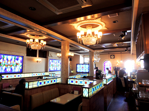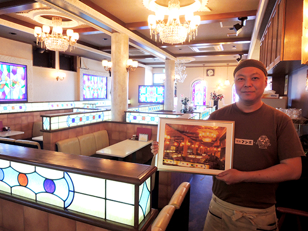 開業後、半世紀以上、子供から大人まで、学生から社会人まで、家族連れからカップルまで……、気仙沼の人たちに愛され、にぎわいを見せていた「喫茶マンボ」。この独特のインテリア、内装が話題を呼び、日本各地からもこの店に足を運ぶ人たちが増えました。老舗店、そして人気店となった「喫茶マンボ」でしたが、2011年3月11日の大地震、大津波によって、店は全壊してしまいました……。その後、間もなく、気仙沼の復興市場「南町紫市場」内に仮店舗で営業を再開。そして、2014年4月30日、現在の場所にリニューアル・オープン! このとき、昔からこの店を知っていた常連さんたち、地元ッ子たちを驚かせ、涙と笑顔で感動させたのが、「もとあった喫茶マンボと、シャンデリアもステンドグラスも、柱の位置や太さも、壁の模様も、椅子、テーブル、何もかも、『まったく同じ、変わっていない!』ということ」でした。岩本さんが手にしているのは、震災前の元の「喫茶マンボ」の店内写真。ほんとうに、同じ店内に驚きます。