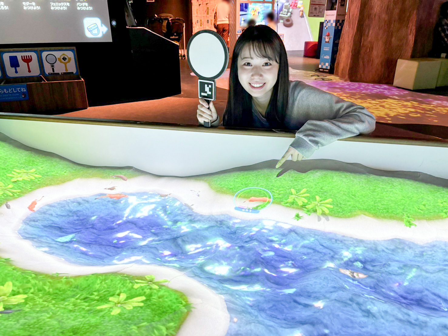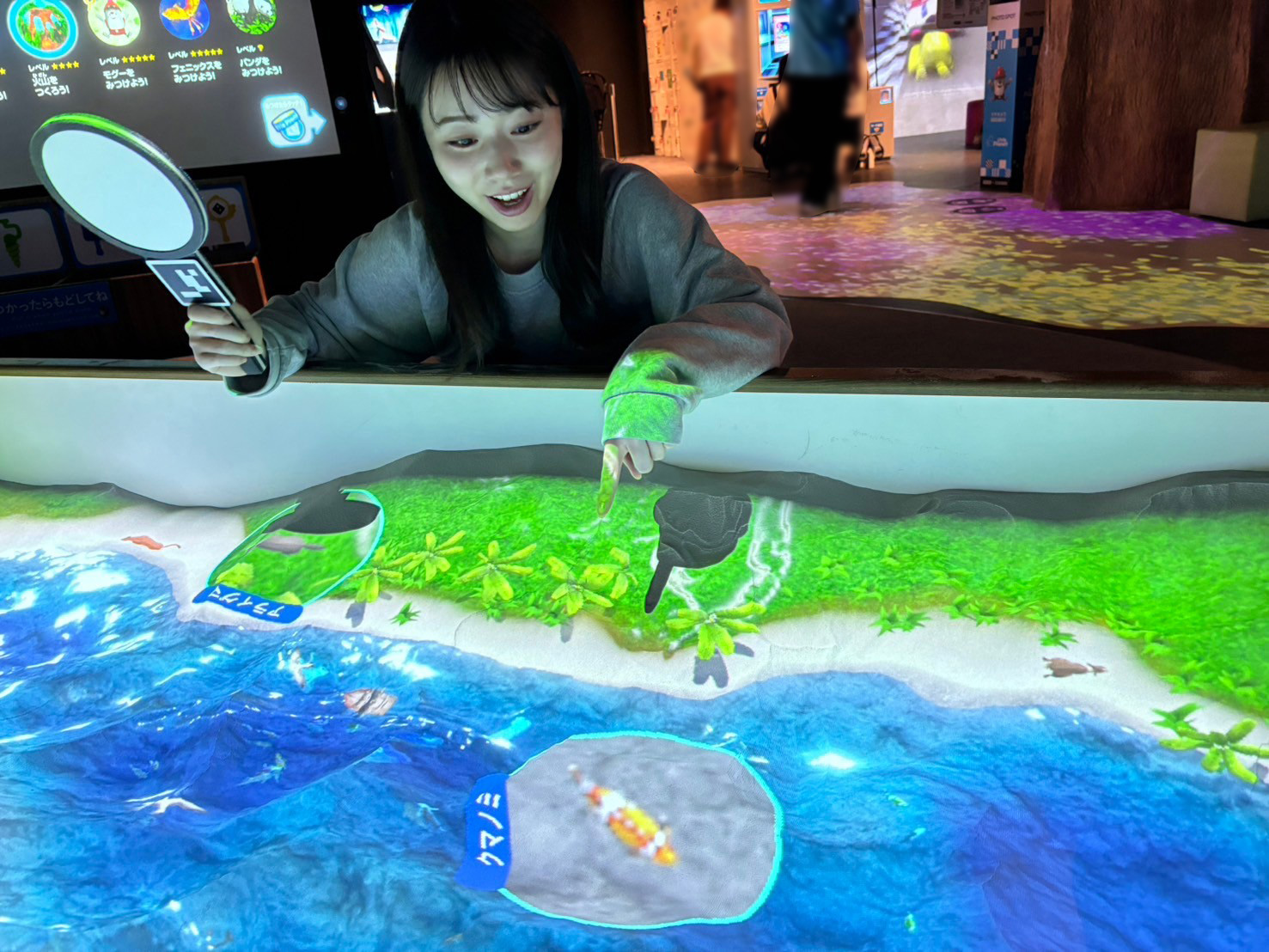 砂場にあらわれる生き物に虫めがねをかざすと、AR(拡張現実)技術によって生きものの名前を調べることができます。