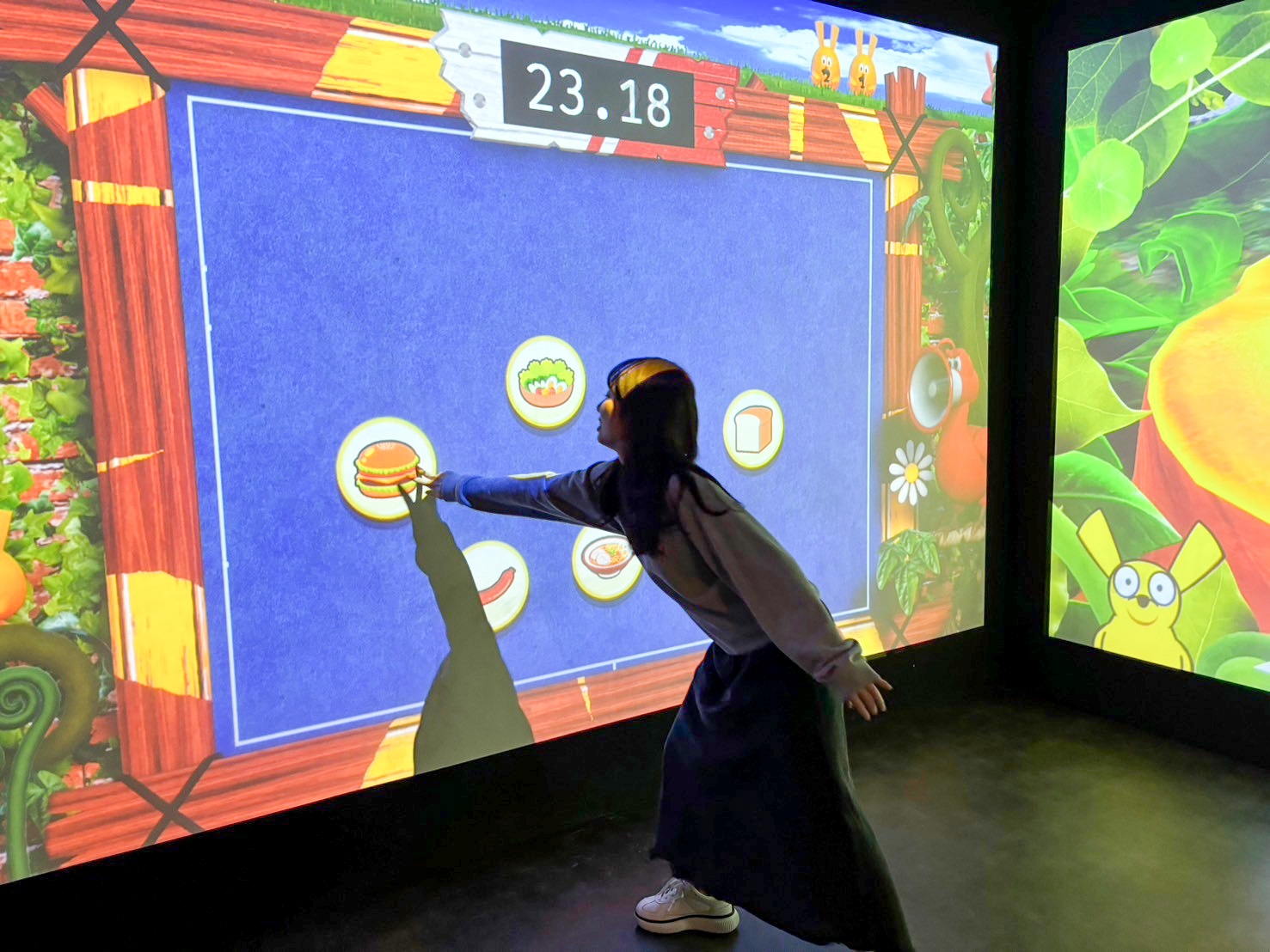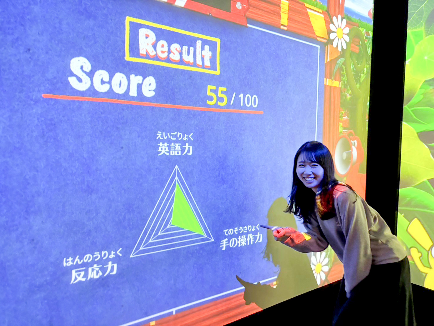 体験型の英語学習アトラクションは、ネイティブスピーカーの発声で出題される英単語を聞き取り、スクリーンに映し出される「正解」を見つけて素早く手でタッチし高得点を目指します!
