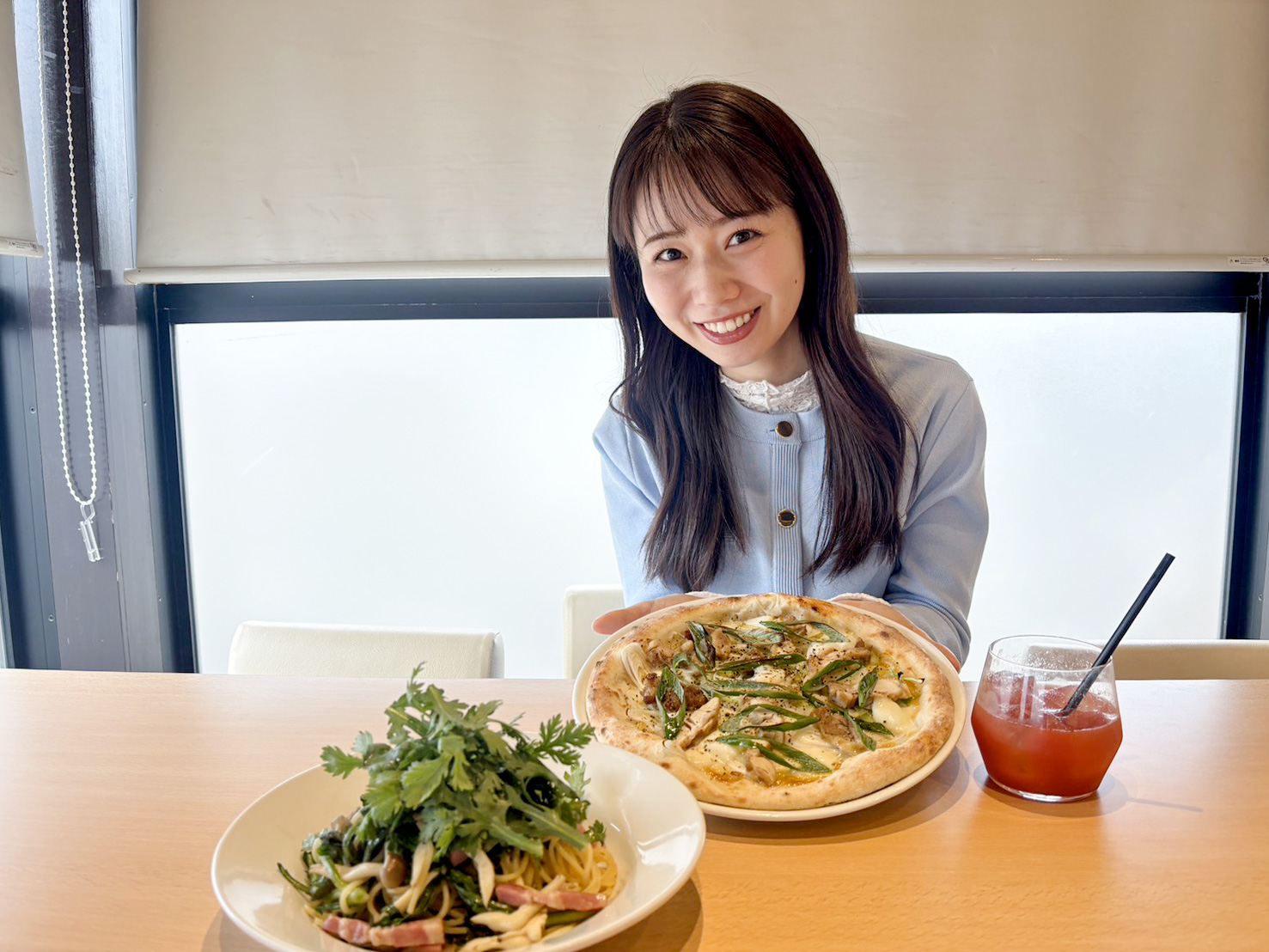 今の季節におすすめなのは、ファームのネギをたっぷり使用した「ネギとチキンのみそマヨピザ」そして採れたての「春菊を使ったパスタ」を頂きました❗️