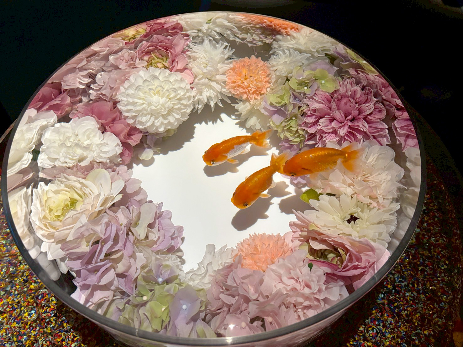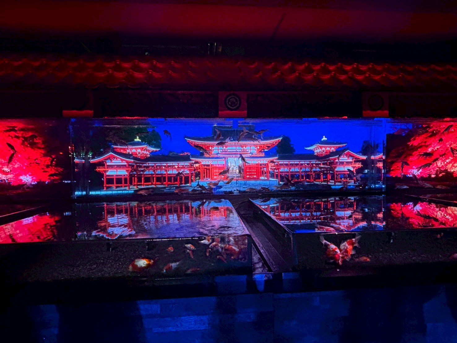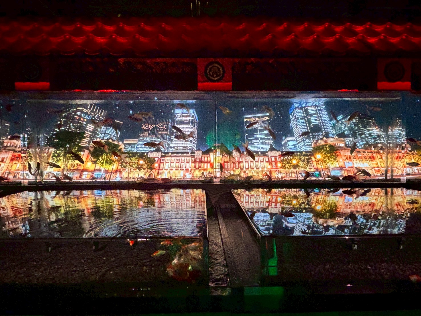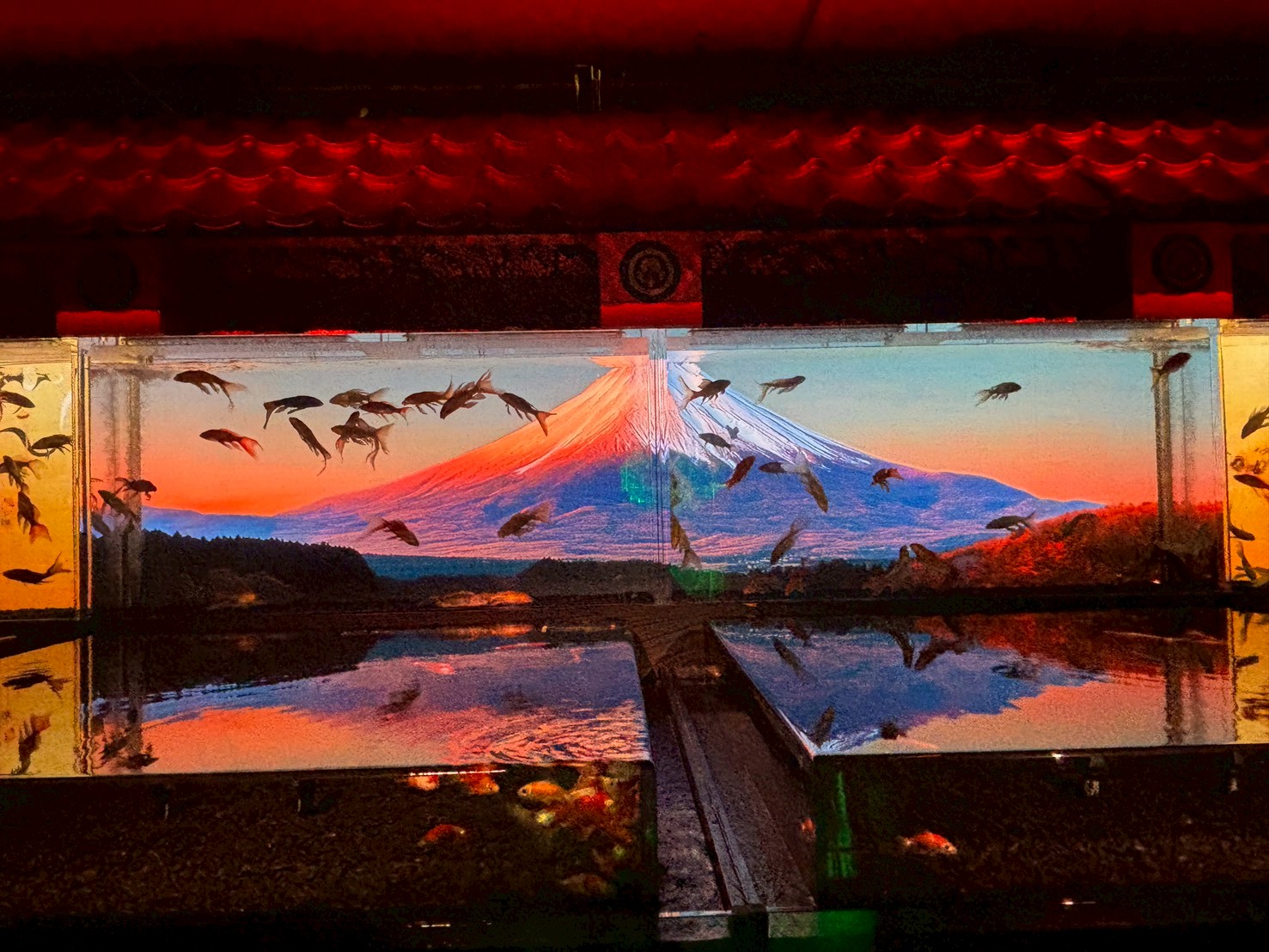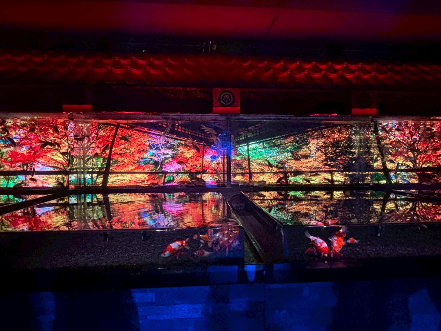 絵巻をモチーフにした横長の大きな水槽、そしてその水槽の下に広がる水盤に見立てた水槽には、埼玉県で生まれた“ヒレナガニシキゴイ”が泳いでいます❗️