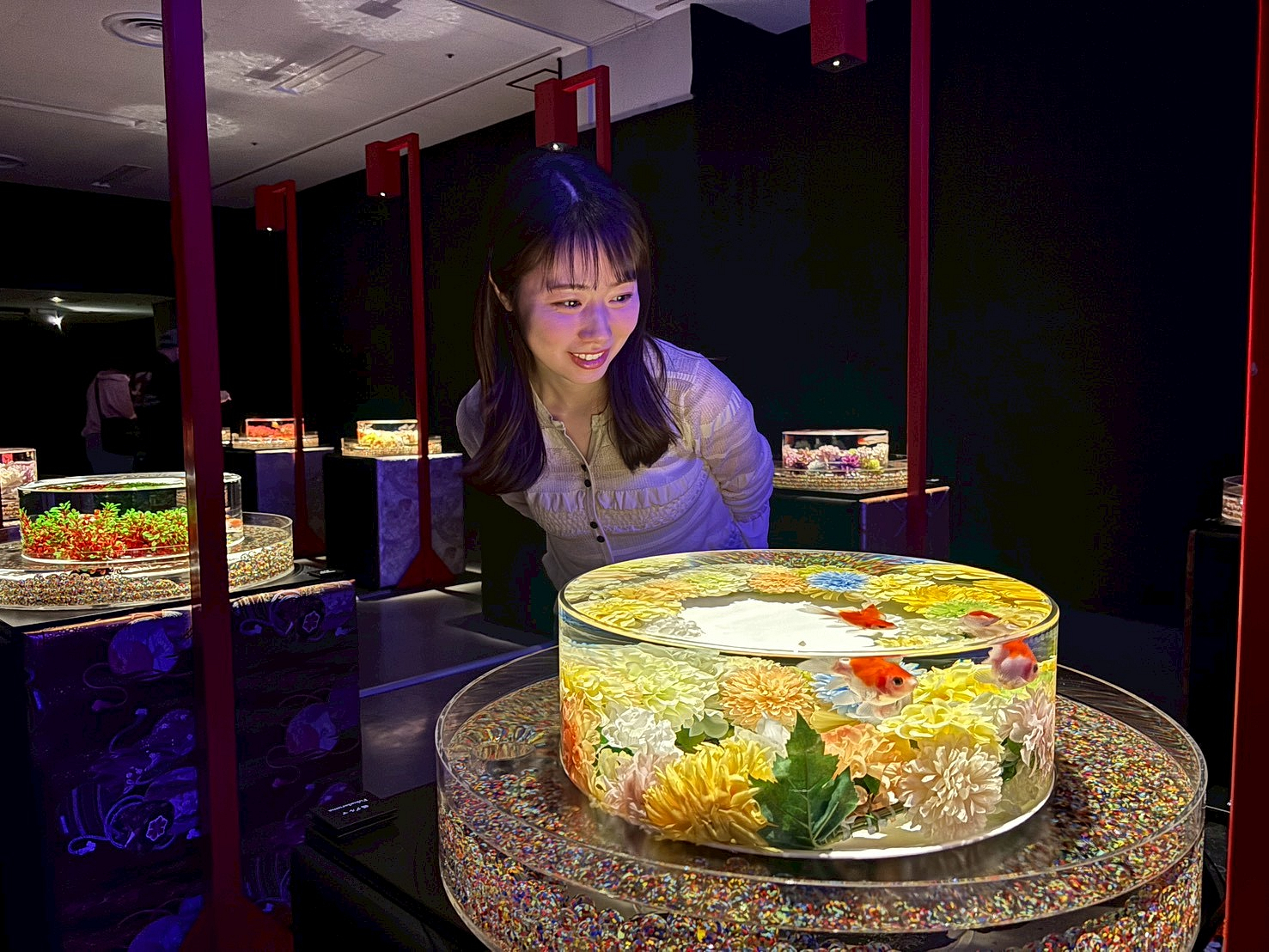 さまざまな金魚の魅力的な姿を、「上見(うわみ)」と呼ばれる江戸時代からの金魚鑑賞方法で楽しめます。