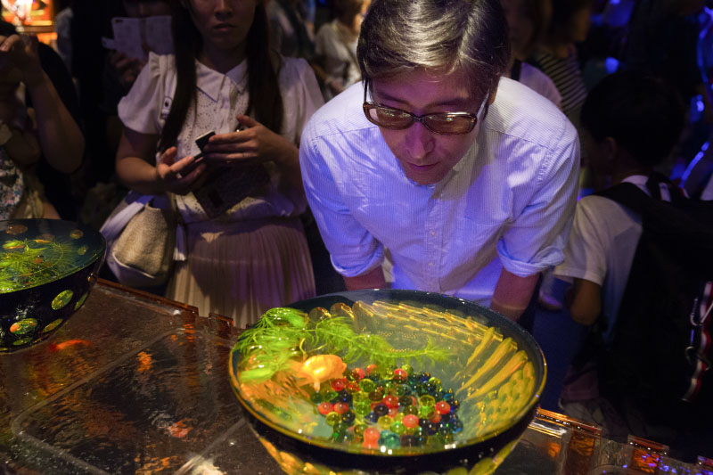 昼間の東京の会場はアート展ですが、19時以降は、お酒を飲みながら楽しめる大人向けのナイトアクアリウムに変わります。イベントも盛りだくさん。週末はDJが入ったクラブに(8月:テイ・トウワ、KEN ISHII 9月:Young Juvenile Youth、DJ KRUSH。7月にはGORGON CITY、石野卓球が出演)。京都の芸妓さんと舞妓さんが踊ったり、大衆演劇の女形の花魁ショーも!