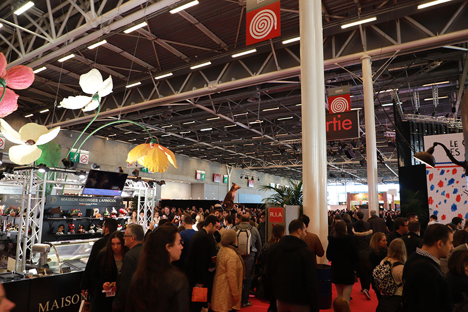 日本のビッグサイトのような会場に、世界60カ国から500を超える有名ショコラ店が集結しています。行きたかったシャポンも出店! シャポンはパッケージがかわいいから、お土産に最適です!