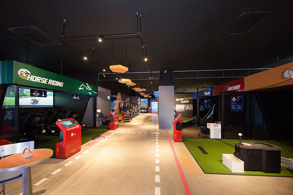 小宮山「ひとつのゲームが通常のゲームセンターひとつ分くらいの広さです。いわゆるAR、拡張現実ですね。例えばアーチェリーだと、前の画面に向かってリアルな弓を放つと中の画面に入っていく。ちなみに、乗馬は本当の馬のサイズの乗り物があります」