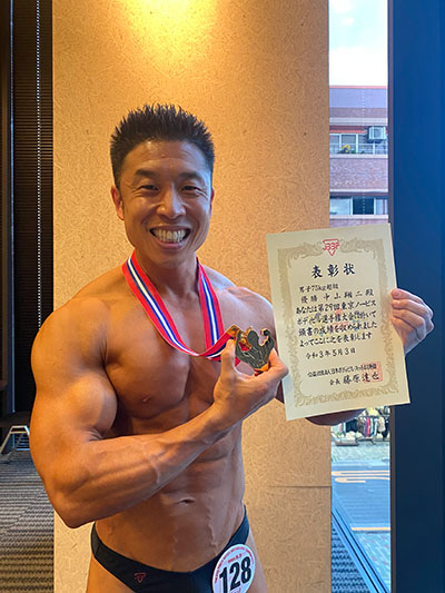 『第29回東京ノービスボディビル選手権大会ミスター75kg超級』で優勝を果たすなど、ボディビルダーとしても結果を残しています。