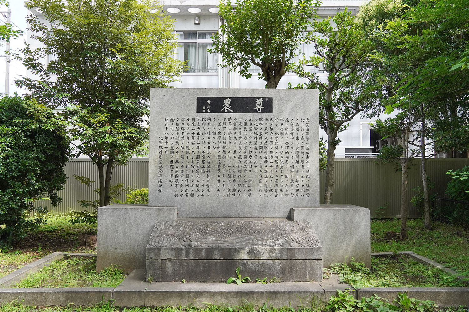 会社の跡地、東京都江東区の釜屋堀公園には、「化学肥料が生まれた場所」として、石碑が建っています。