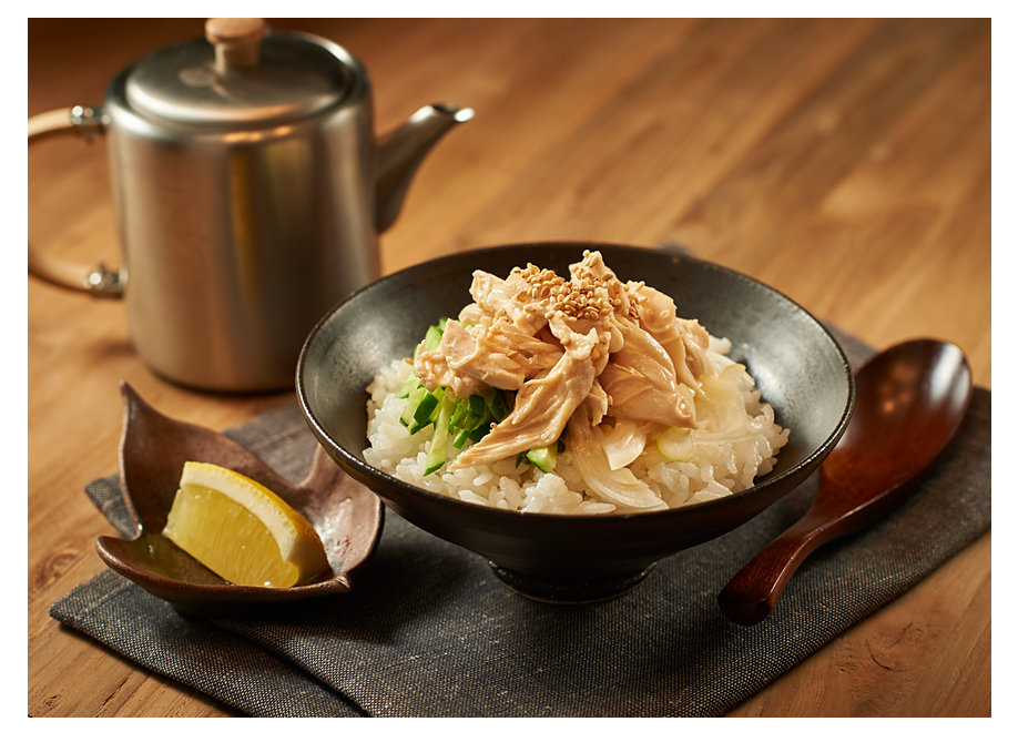 温かいご飯を茶碗に盛り、千切りの長ネギ、キュウリをのせ、(2)のゴマダレで和えた鶏肉をのせる。
