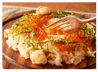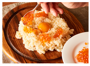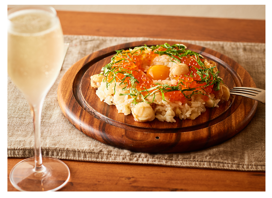 お皿にリゾットを盛り、中央に卵黄を落とし、周りにイクラを盛り付ける。
