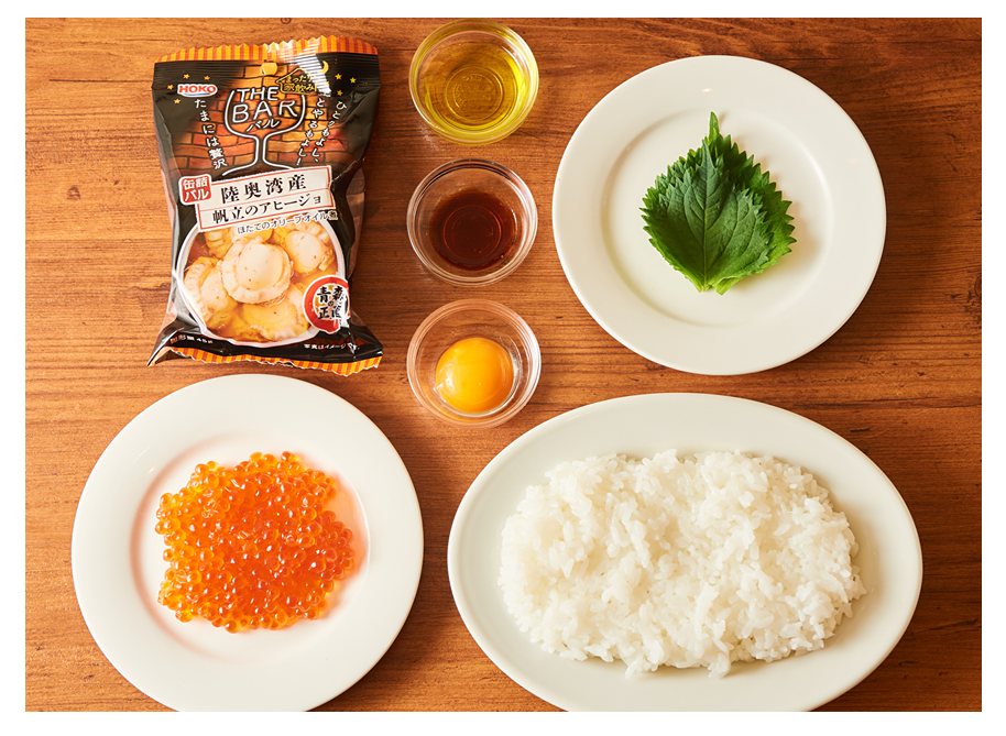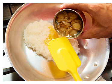 火をかける前のフライパンに冷やご飯、醤油、水、ホタテ缶を具と液汁ごと入れる。