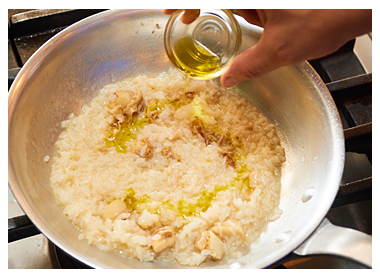 火にかけておかゆ程度の水分になったら、火を止めオリーブオイルを加えてよく混ぜる。