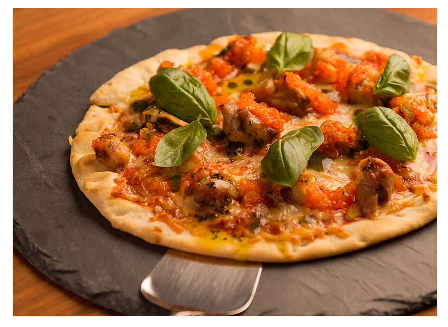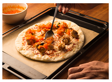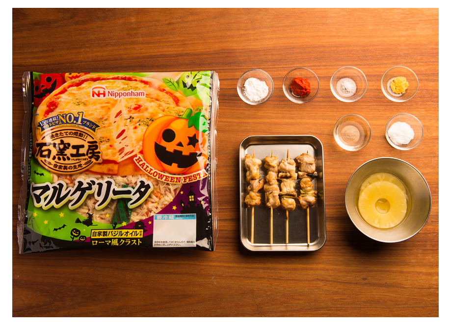 石窯工房®マルゲリータ・パン・ピザに、焼鳥と(3)のソースをかけて焼く。