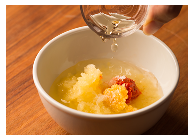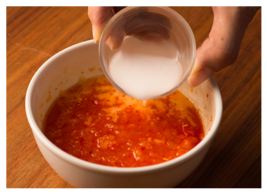 耐熱性の器に(1)と★以外の調味料をすべて入れ混ぜ、レンジで40秒加熱する。水分を飛ばすため、ラップをかけずに加熱して下さい。(加熱した器は熱いので、取り出しの際はご注意ください。)