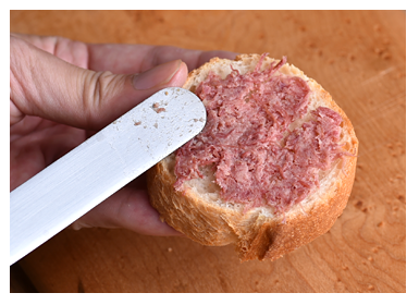 フランスパンにコンビーフを塗る。コンビーフにすりおろしたニンニクを入れても美味しいです。