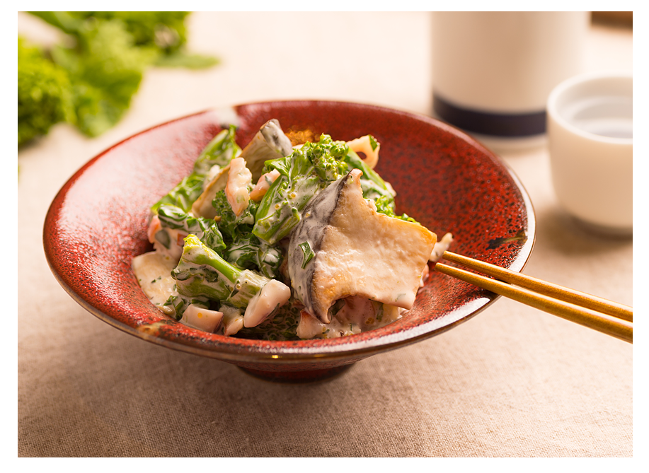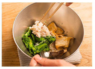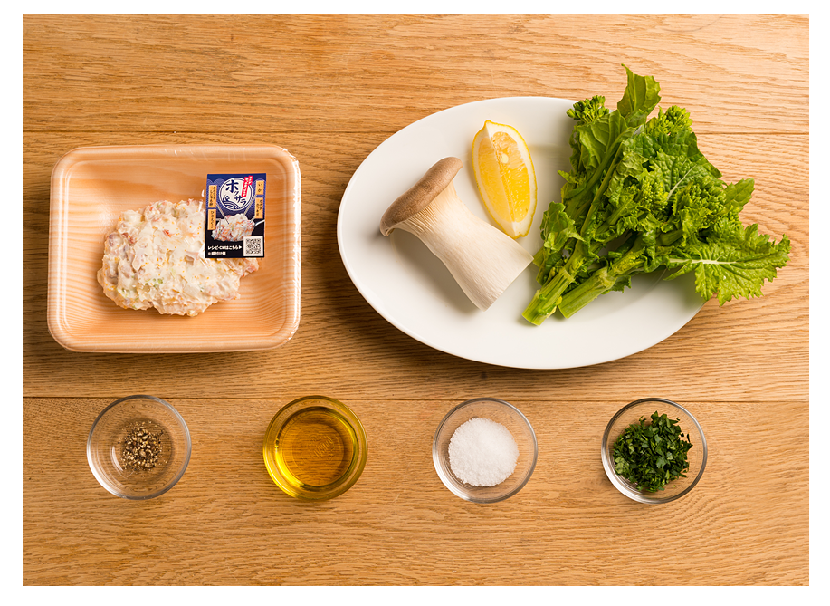 ボールにレモンを絞り、刻みパセリ、オリーブオイル、こしょうを入れ混ぜ、さらに菜の花、ホッサラを加え軽く混ぜ合わせて完成。