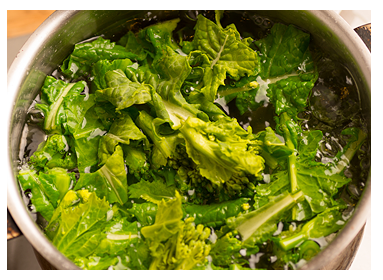 鍋にたっぷりのお湯を沸かして、塩を入れ、3等分した菜の花を下の部分から順番に投入して30秒ほど茹でる。