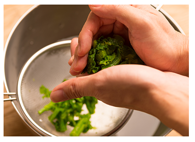 菜の花をすぐ氷に入れた冷水で冷やし、しっかりと水気を絞る。