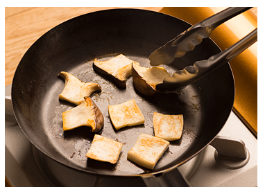 エリンギを横半分にし、縦に4等分くらいにカットし、フライパンで香ばしくなるまで焼く。