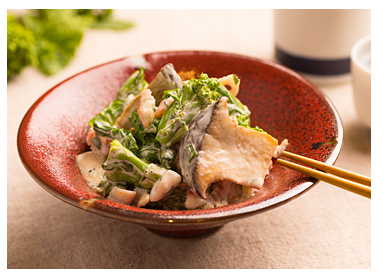 エリンギの香ばしさと菜の花の苦味がホッサラと相俟って、料亭の味となっている。お酒のお供に!特に日本酒によく合います♪