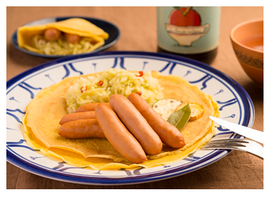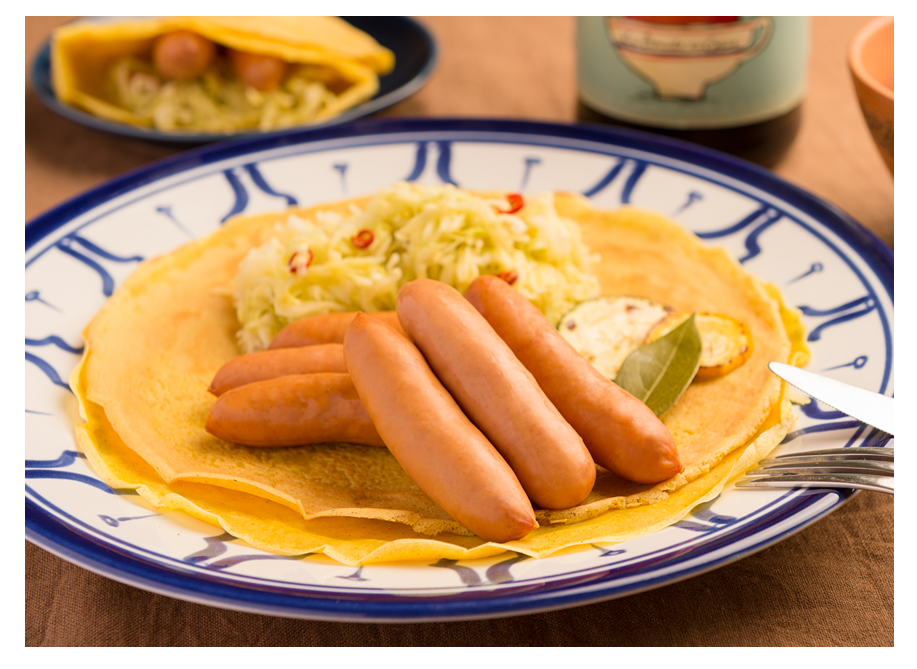 シャウエッセンを茹でクレープにザワークラフトと共に巻いて完成。お好みでこしょうをふっても美味しいです。